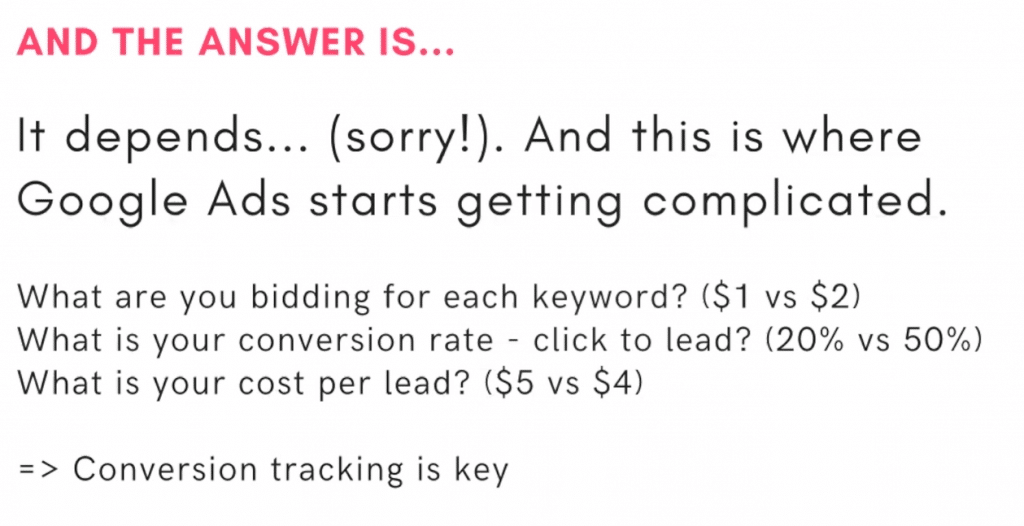 Then, sit down and establish the desired number for your customer lifetime value and look at your Google Ads campaign to determine if your ROI (return on investment) is working.